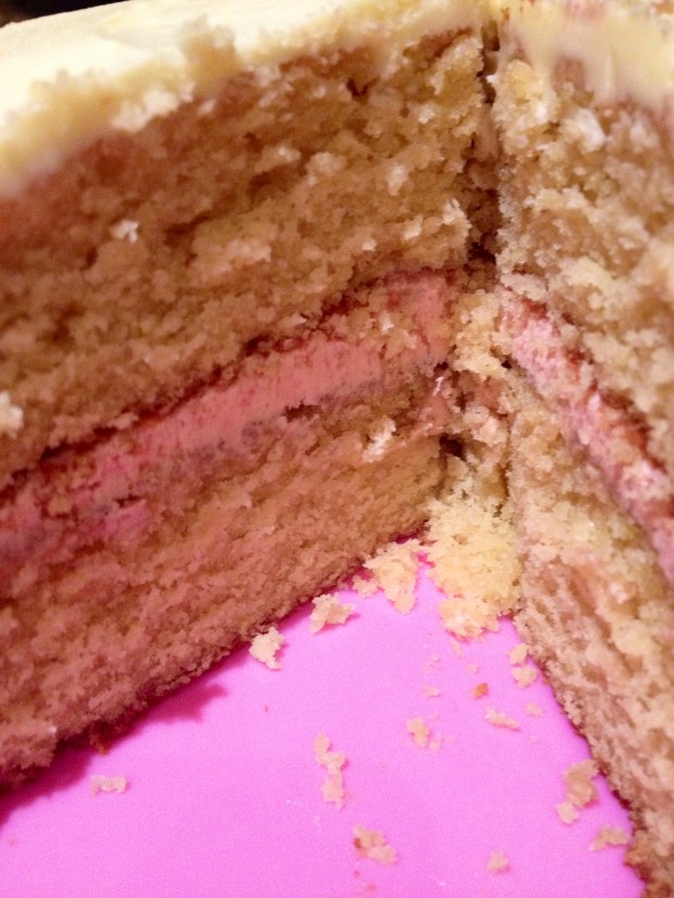 - Take the strawberry buttercream and spread onto one of the cake halves and place the other on top, gently pressing onto the sponge so it is well secure and a little icing begins to show at the side