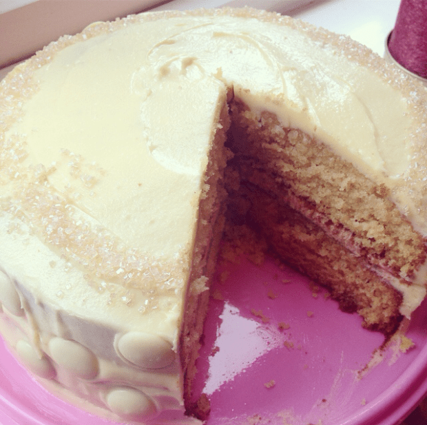 - Next, the fun part begins! With a palette knife, begin smoothing the white buttercream on top of the cake before the sides. Sadly, there’s no real technique here as I seem to do this differently everytime so aslong as the cake has a smooth and thick layer to cover the sponge, it will look lovely! One small tip would be to ensure the palette knife is kept clean inbetween icing as this will help smoothing the buttercream