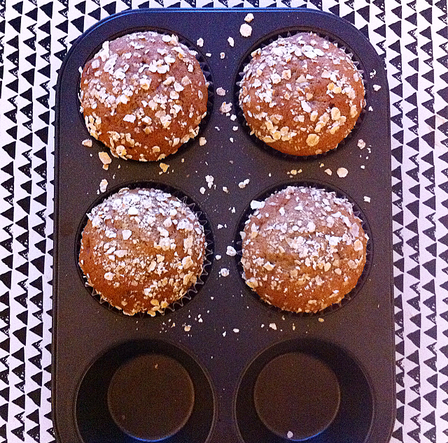 - Once the mixture is combined, but still a bit lumpy, place into the 12 cupcake or muffin cases and cover the top with the rolled oats