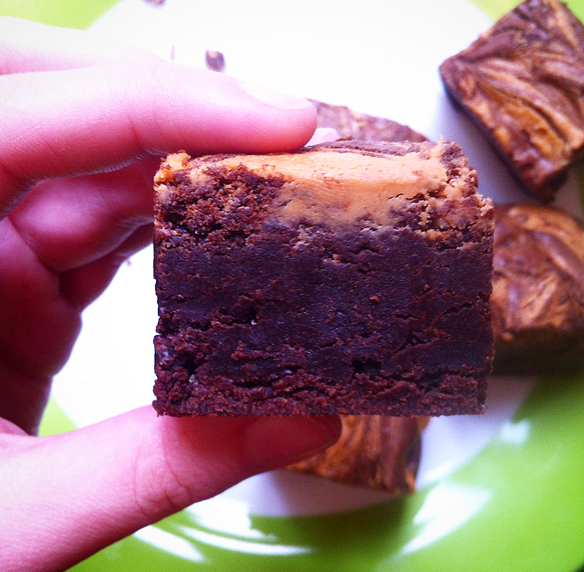 4. Once combined, pour into the prepared brownie tin and melt the remaining peanut butter in the microwave for 20-30 seconds. Drizzle the melted peanut butter over the top of the brownie mixture and then,  using the end of a cake tester/metal skewer, slightly stir in the peanut butter to create a marble effect