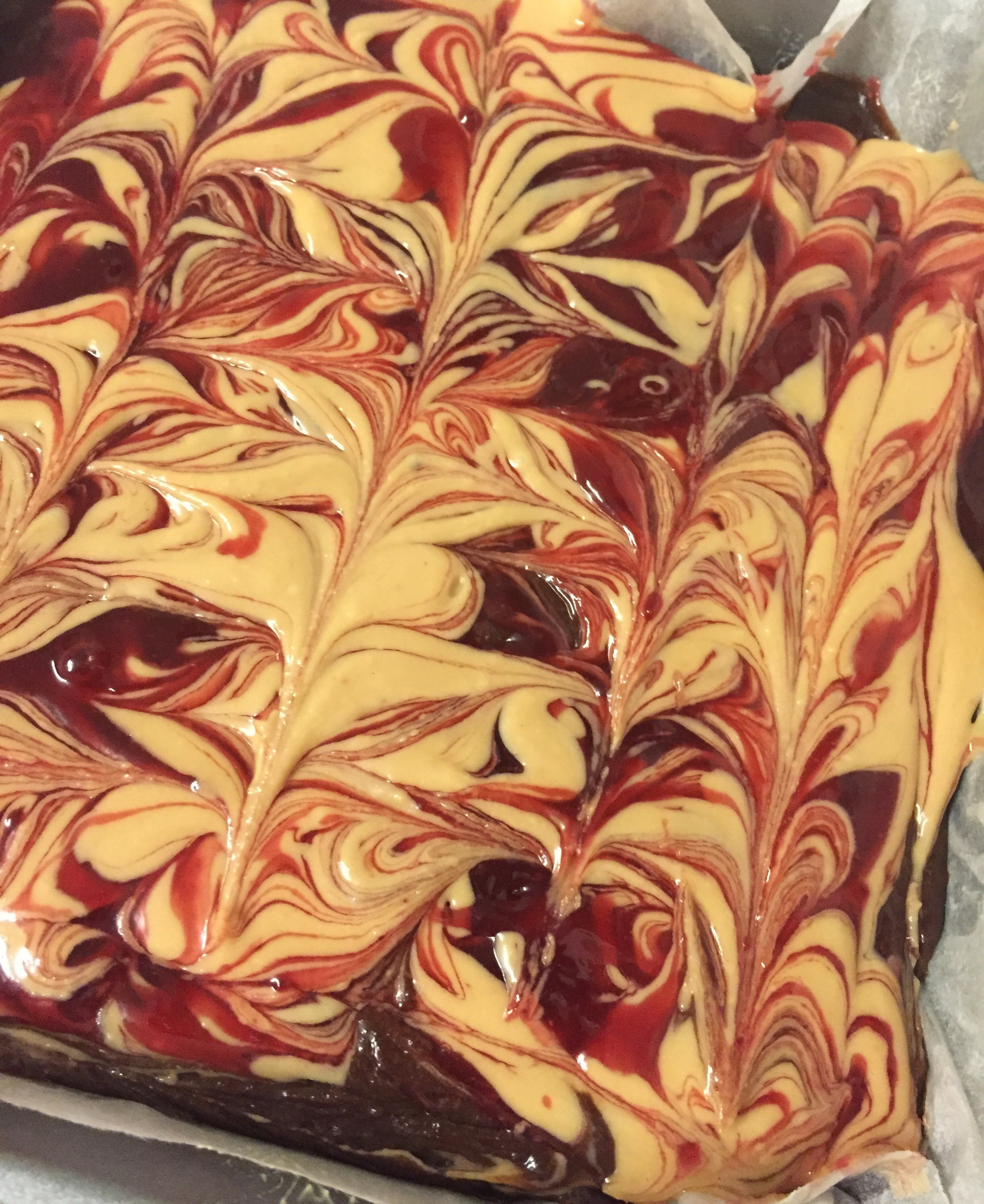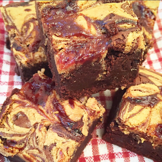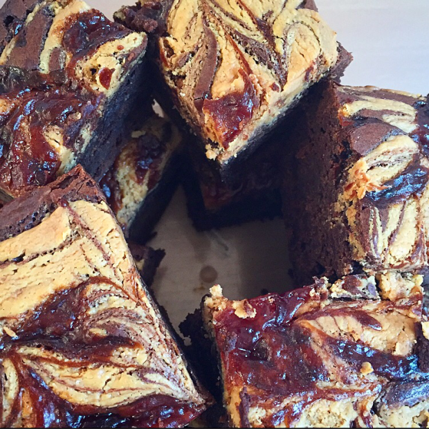 - Begin by drizzling the melted peanut butter over the top of the brownie mixture and then begin to add dollops of the jam over the top. Using the end of a cake tester/metal skewer, slightly run the tip through the brownie/peanut butter and jam mixture to create a marble effect (you should only need to go up down and across 3-4 times