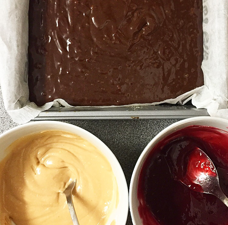 - Once combined, pour into the prepared brownie tin and melt the remaining peanut butter in the microwave for 20-30 seconds. Once melted (so it’s easier to drizzle) set to one side and add the jam into a separate bowl and begin to mash