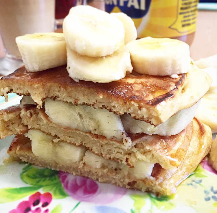 - Finish by sandwiching your pancakes between some chopped bananas and serve with a topping of peanut butter and a drizzle of maple syrup (optional)