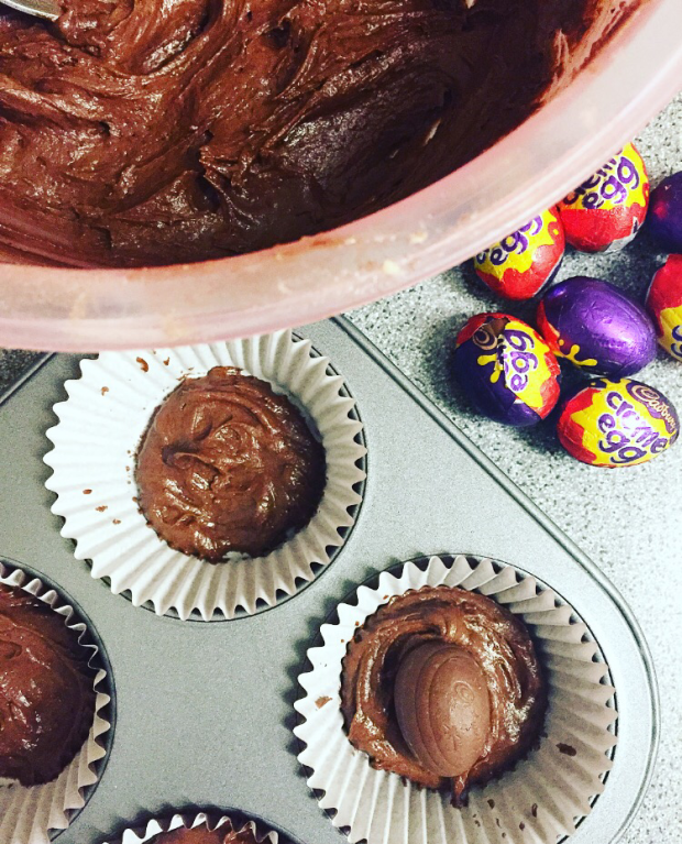 - Add the sifted flour and cocoa powder before mixing all of the ingredients together, so you have a smooth, creamy chocolate batter. Place a teaspoon of mixture into each cupcake case, then place a frozen Creme Egg in the middle, lightly wedged in the cake batter. Fill until the cake cases are a third full and the Creme Egg is hidden
