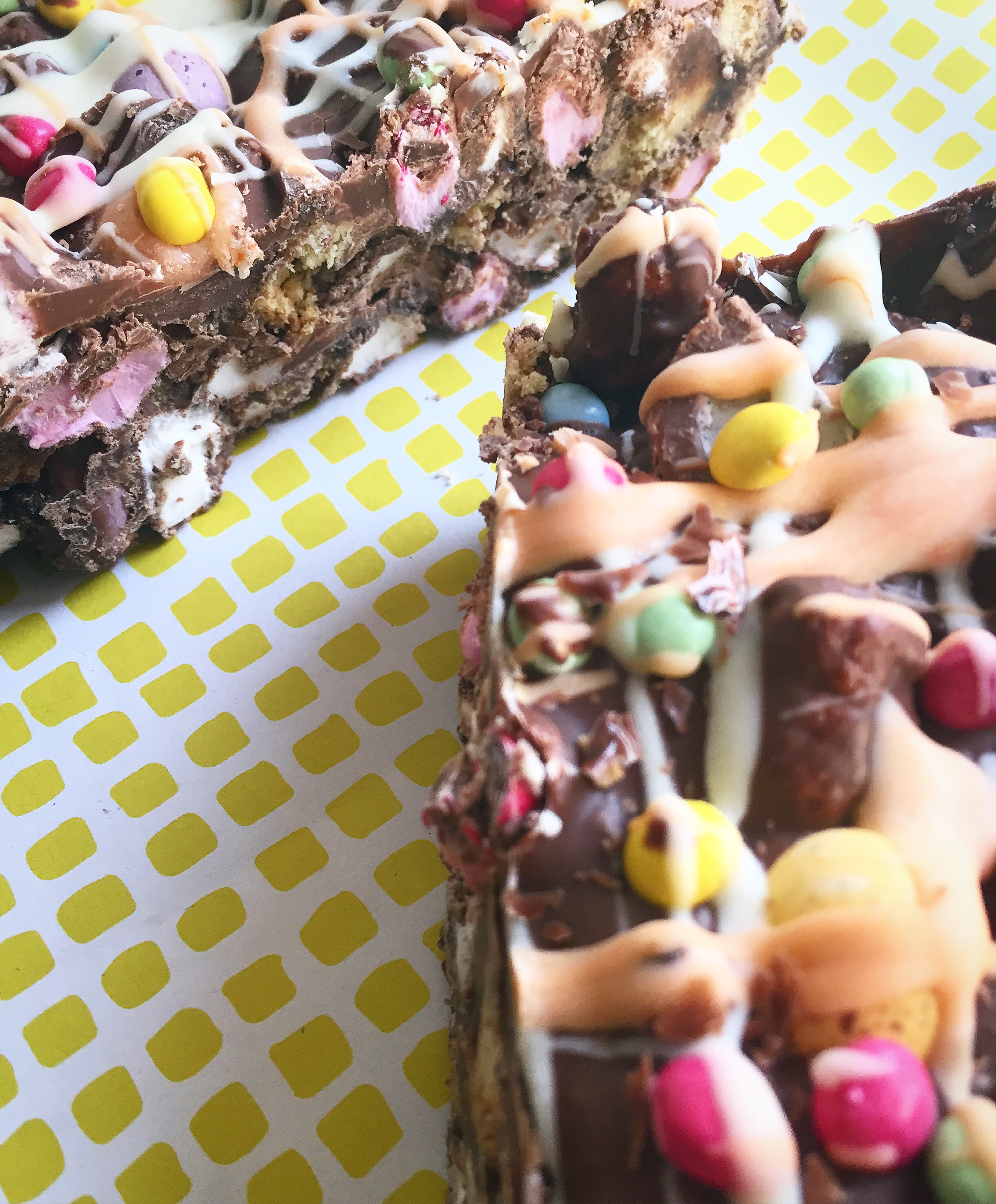 - Sprinkle your colourful chocolate beans/Smarties on top for more decoration before horizontally drizzling white chocolate on the top (I also used some yellow food colouring gel on half of the White chocolate for more of an Easter feel