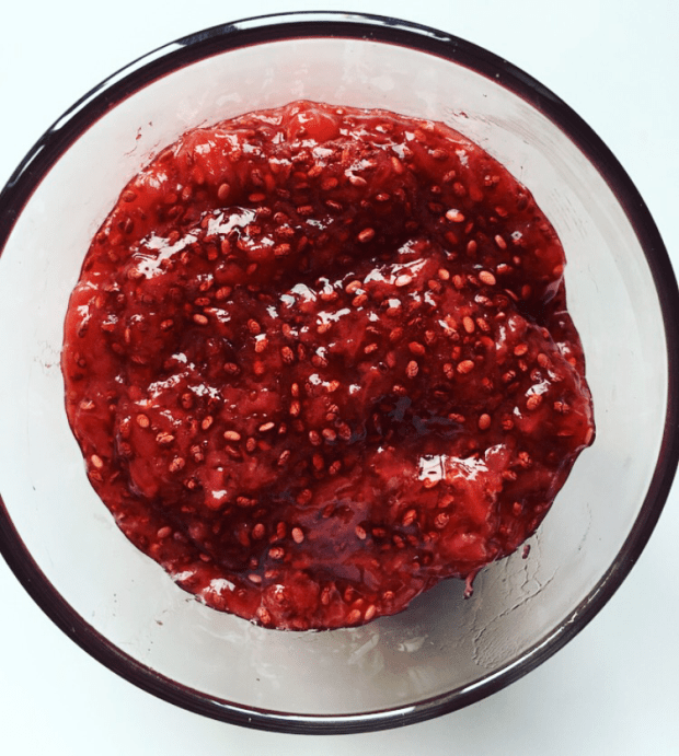 - Add the chia seeds and mix into the strawberry/honey mixture and place back onto the hob for a further 20 minutes, stirring occasionally so the mixture doesn’t stick