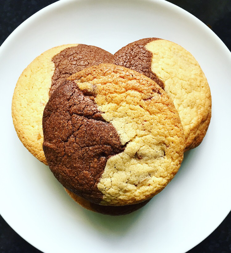 - Take a small amount of each dough and roll together in the palm of your hand to create a golf ball sized amount of dough. Place on the baking tray and flatten slightly with your hand. Each cookie should be about 3cm apart to allow for them to expand slightly