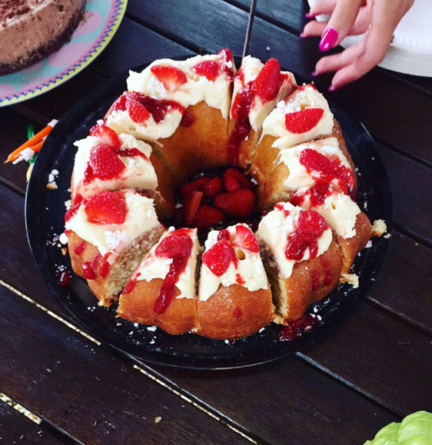 - Place in the Bundt cake tin, tapping the bottom of the tin on the surface lightly so all the cake batter seeps into the creases. Then, take your jam and spoon dollops of it in random spots on top of the cake batter (you should use a 1/3 of the jam) and create a marble effect with a skewer. Give it another tap on the surface before placing in the oven for 30-35 minutes or until the cake is a light golden brown colour and a cake tester comes out clean