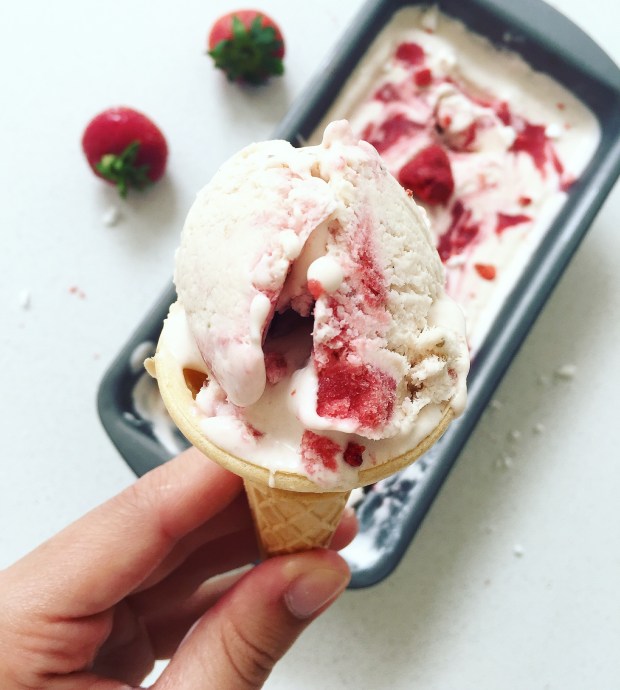 After making an insane Strawberry Eton Mess Bundt cake the other week, I decided to try my hand at an equally delicious ice cream version – ya know, now that us Brits believe we’re in the meditaranean thanks to a current and very gorgeous heat wave.