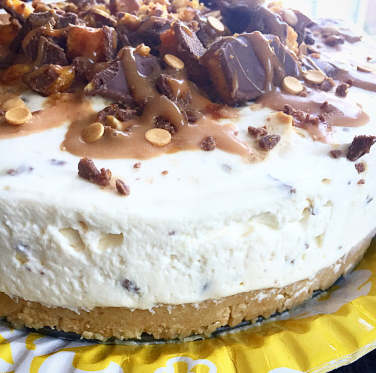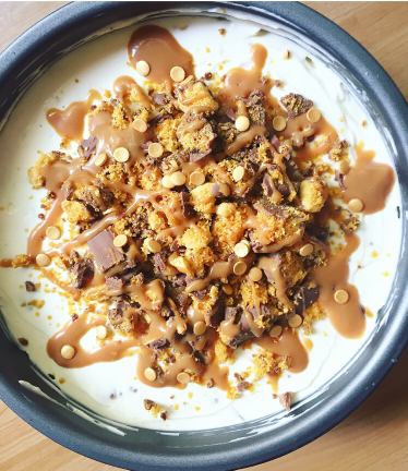 6. Once removed from the fridge and fully set, remove from the tin and decorate with the crushed Crunchie bars and drizzled caramel just before serving. The cheesecake will keep for around 3 days after making