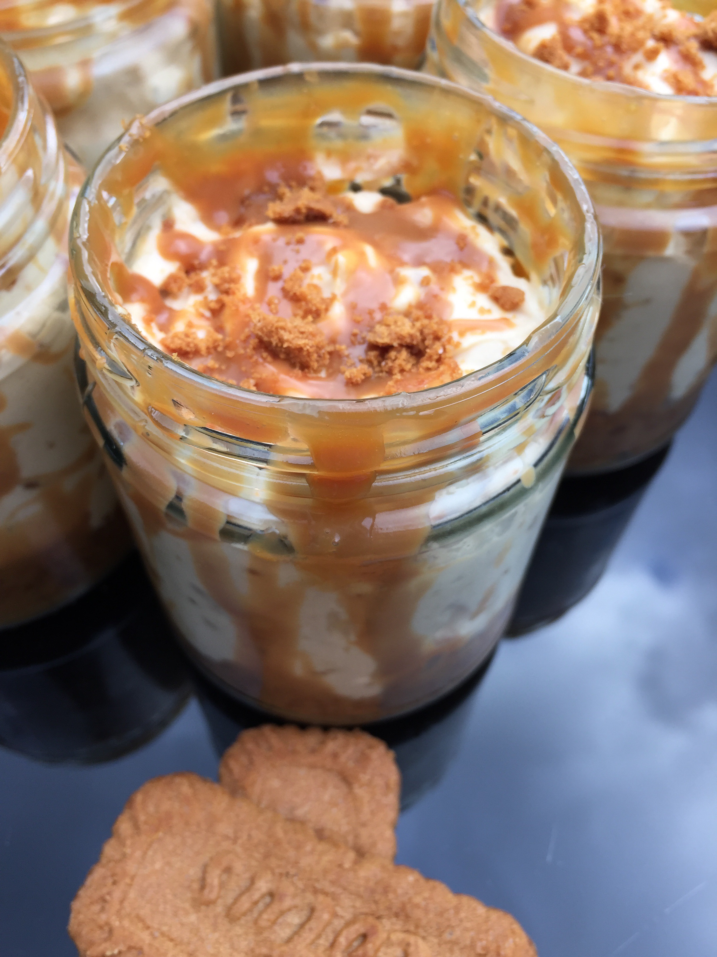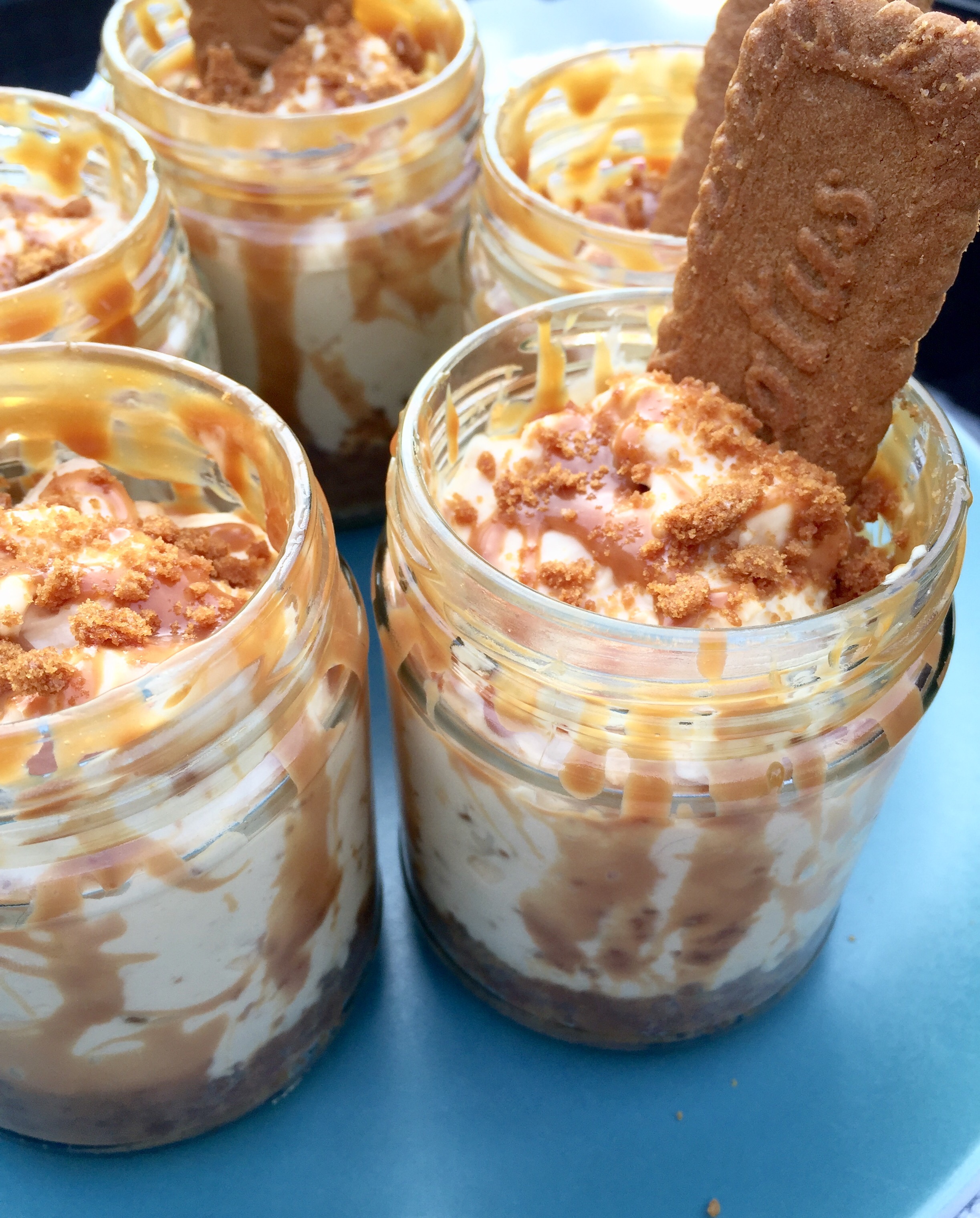5. Spread on top of the biscuit base(s), smoothing with a palette knife if possible and place back in the fridge to fully set overnight. This is ideal, if not possible then a minimum of 4-6 hours (we gobbled our I’m jar versions after 4 hours because we couldn’t wait)