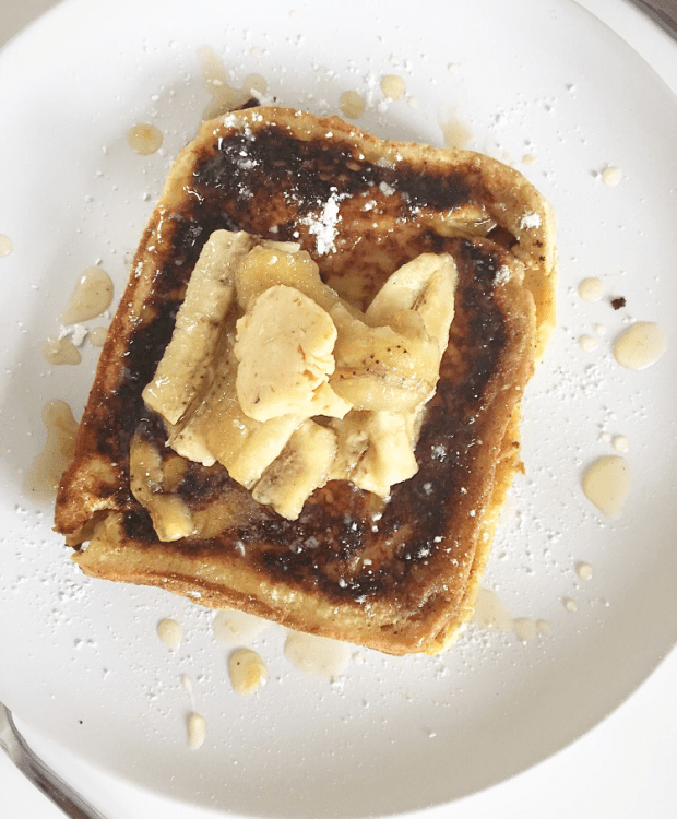 5. Once both the pieces of bread are suitably toasted, place on a plate,  remove the maple butter from the fridge and add a generous teaspoon on top of each piece of toast. As it melts, pour your caramelised bananas on top and enjoy with a decent cuppa, it’ll be the best wake up call yet!