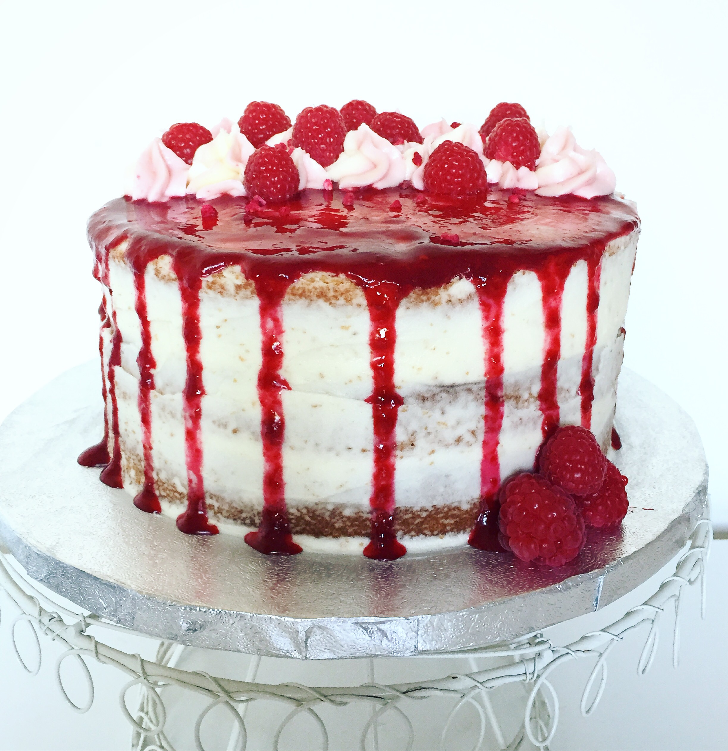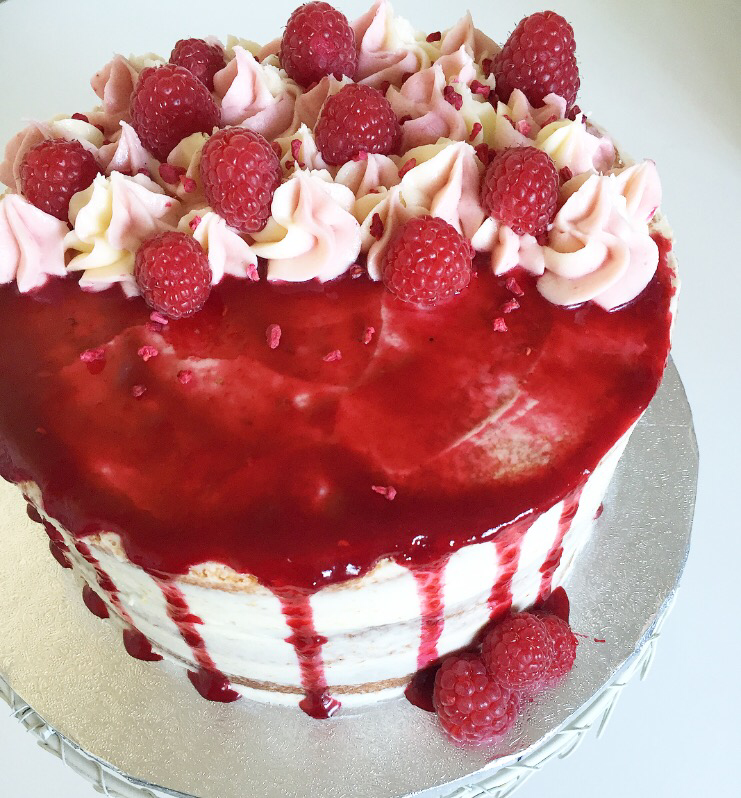 10. Once your cake is nicely drizzled, leave it for a little while to set slightly before piping some of your remaining buttercream on top of the cake. Finish by adding a few rasberries and sprinkling with the freeze dried raspberries and gold confetti. Serve within 3 hours of baking for best results and keep any remaining slices in an air-tight container for up to 3 days