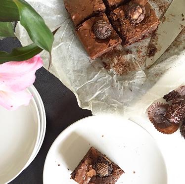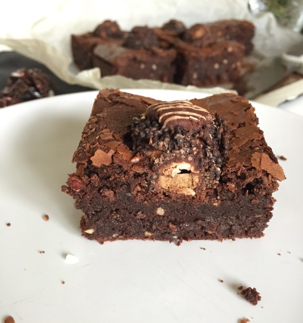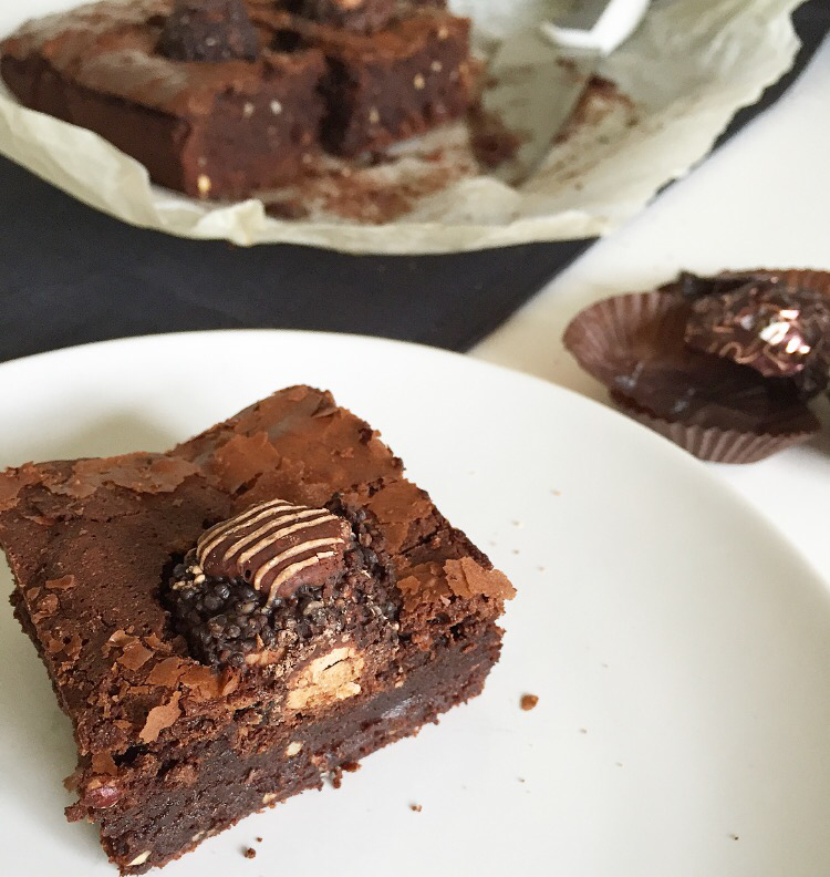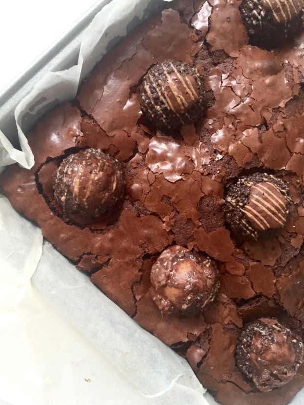 - Pour the brownie mixture into the baking tray and set a timer for 30-35 minutes – at 25 minutes, or a few minutes before removing from the oven (the brownie shouldn’t be wobbling in the middle at this stage) mark with a sharp knife where you will cut the brownies into 12 squares and place a Forrero Rocher in the middle of each piece. Place back in the oven for the remaining time and remove once baked through