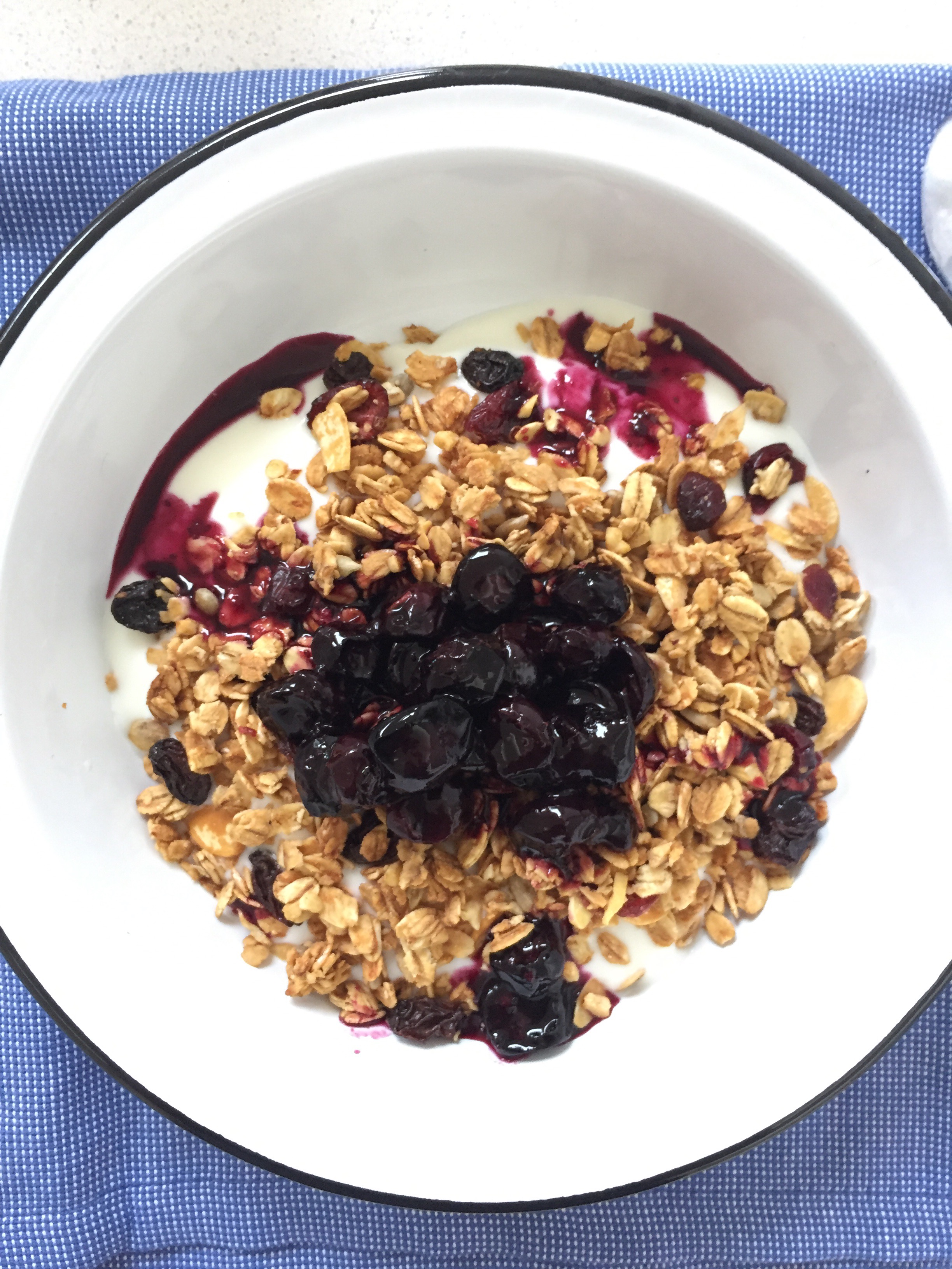 If I don’t have my granola with milk and some fresh fruit in the morning, I love it with a fruit compote and some natural yoghurt (again, coconut yoghurt works well here) and blueberry compote is my absolute fav. It tastes scrummy and it givesa beautiful purple flavour when mixed with the yoghurt.