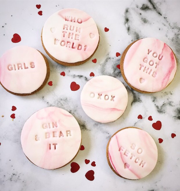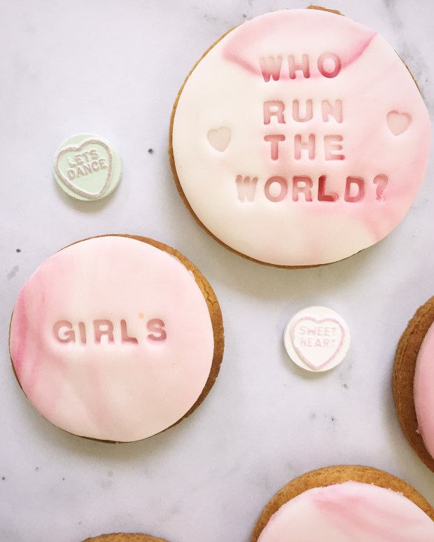 - Paint each biscuit with a thin layer of jam and then add the pink marble icing on top before using your letter press to create your empowering ‘girl power’message