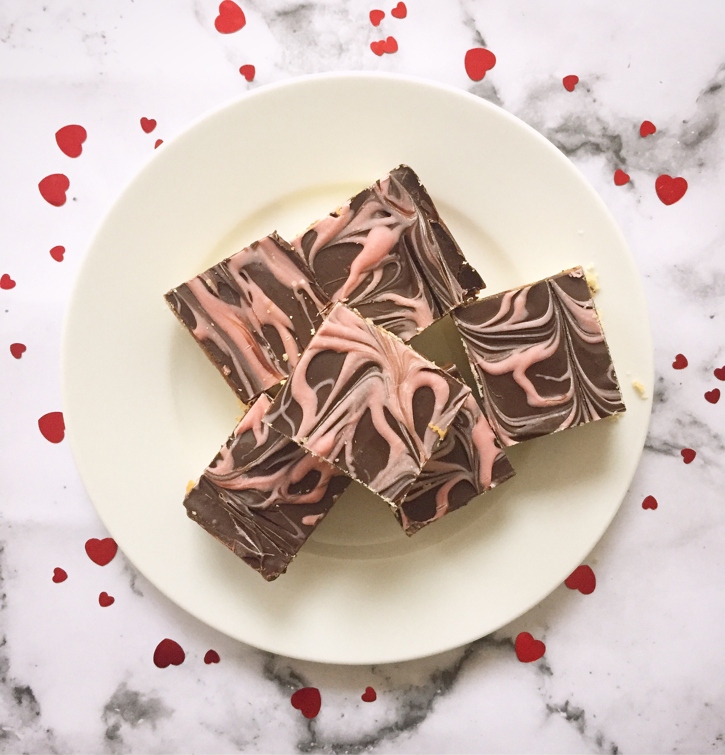 - Place into the fridge for 1-2 hours, or until the caramel ‘sets’. Finally, melt the milk/dark chocolate in 20 second bursts in the microwave and then pour on top of the caramel. Next, melt the white chocolate and add a drop or two of pink food gel and drizzle on top of the milk chocolate, running a sharp knife or skewer through it so you create a marble effect. Place back in the fridge until the chocolate is set and cut into squares