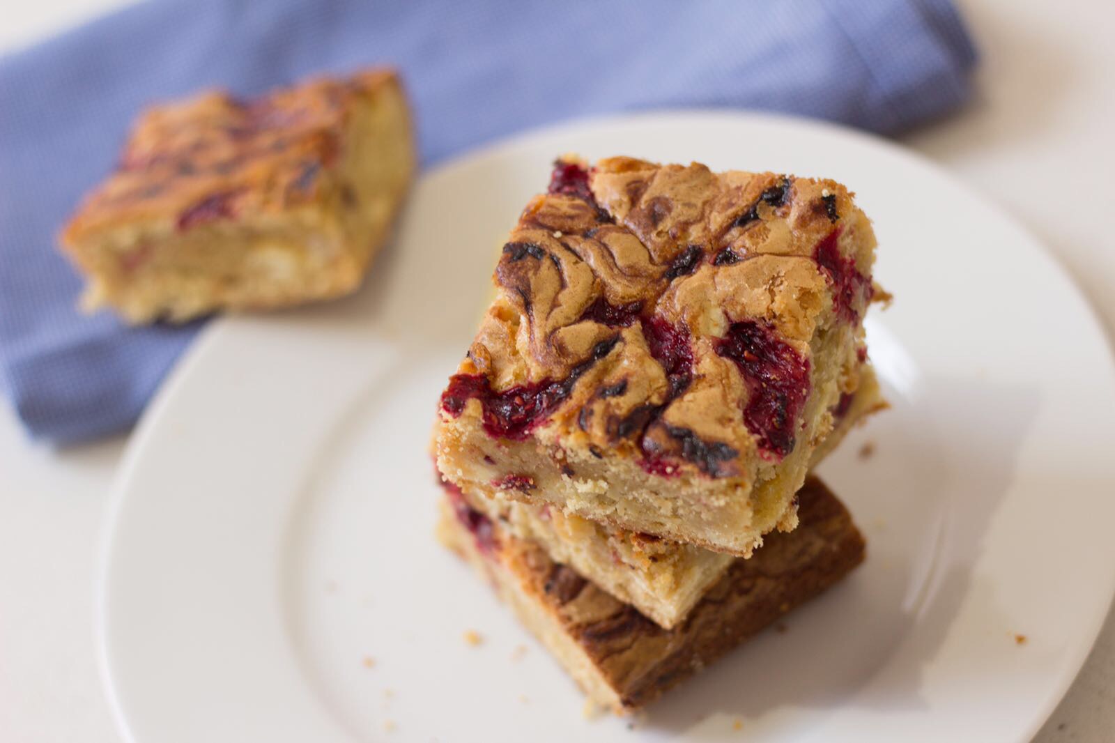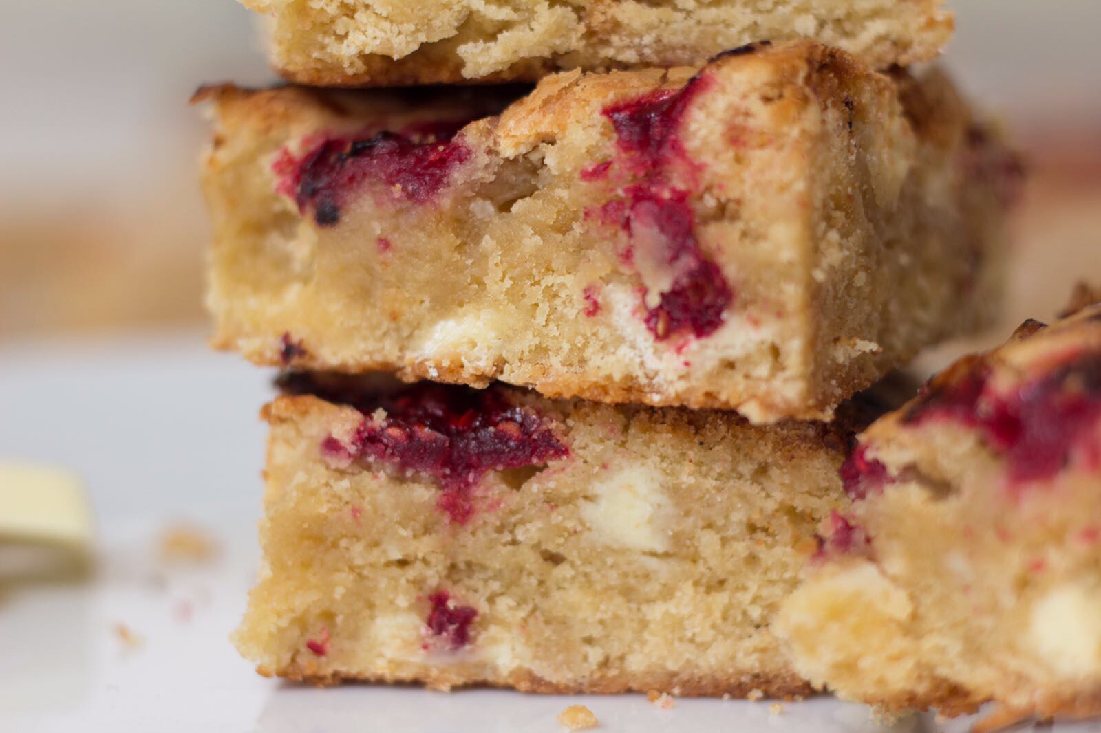 - Pour into the tin and then dollop some raspberry sauce in random spots. Marble the sauce through the Blondie batter with a skewer or sharp knife then bake for 22-25 minutes, until set on top and there’s just a little wobble in the middle