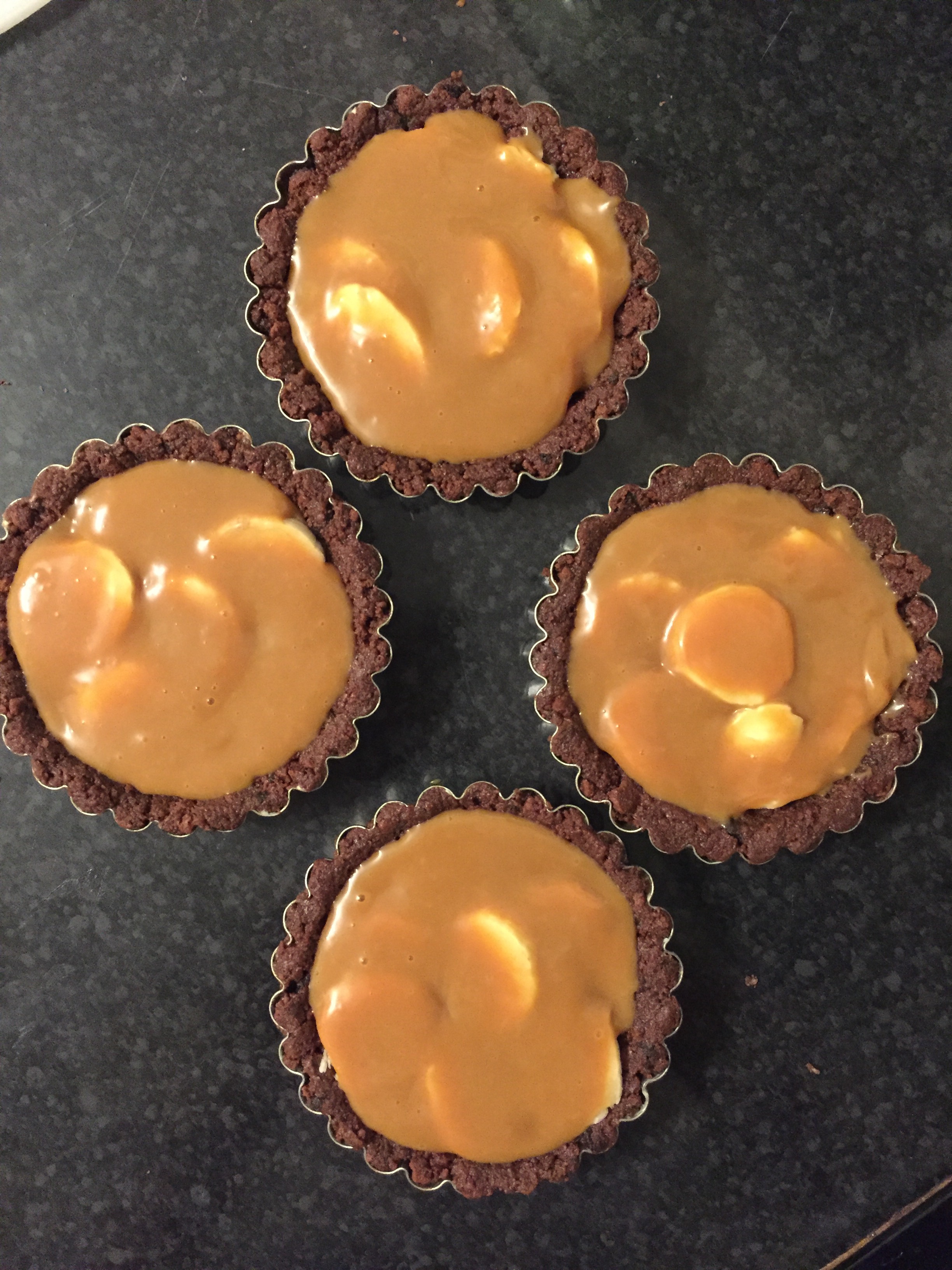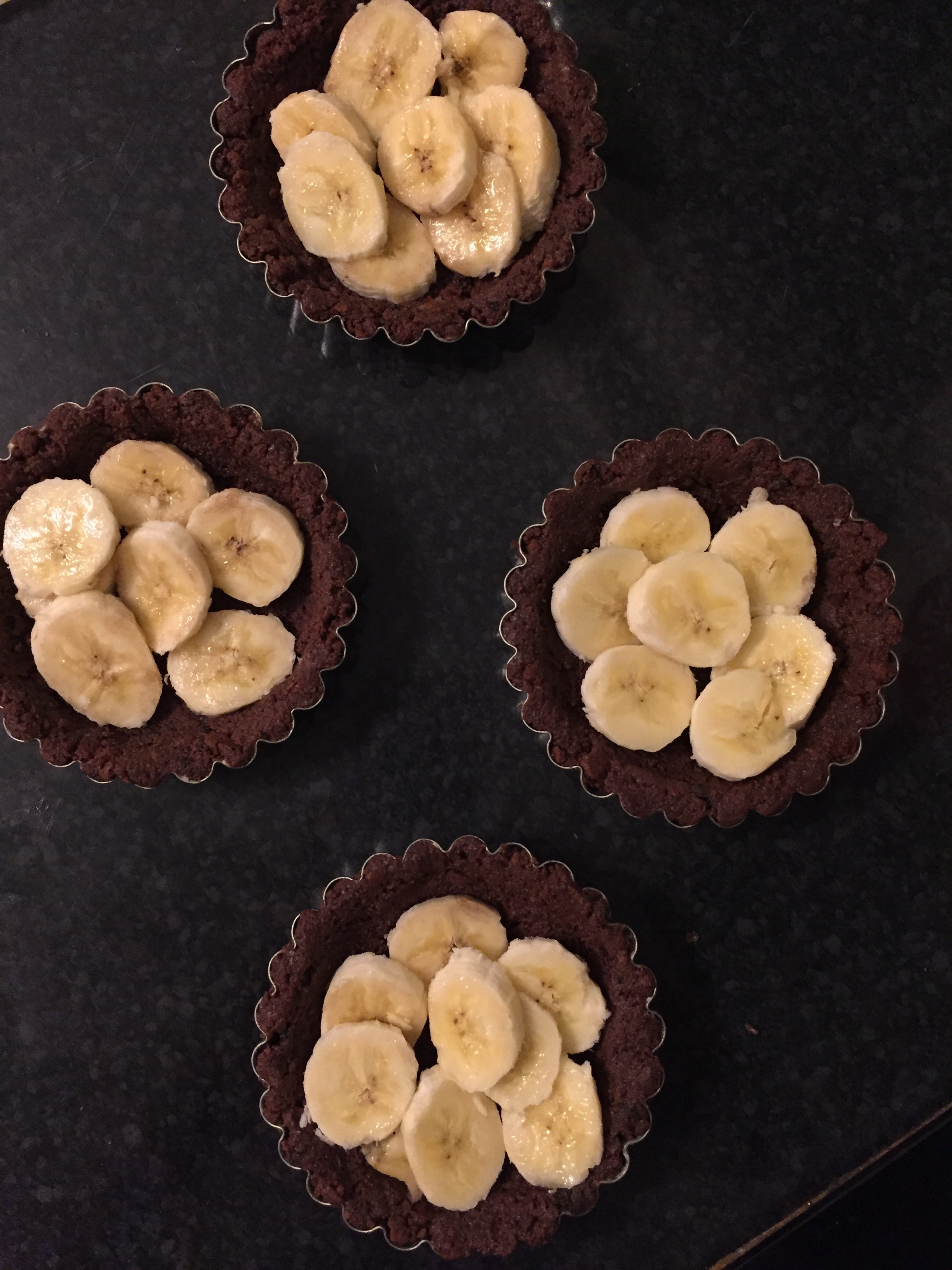 2. Pour enough of the biscuit/butter mixture to cover the sides and base of each tart tin – do this by pressing with the back of a metal spoon. Place the tins into the fridge for 10-20 minutes until set. Next, slice the bananas and place on top of your set biscuit bases. Warm the caramel in the microwave for around 10 seconds if it doesn’t become runny by stirring it, then pour over the bananas until almost reaching the top of the biscuit cases
