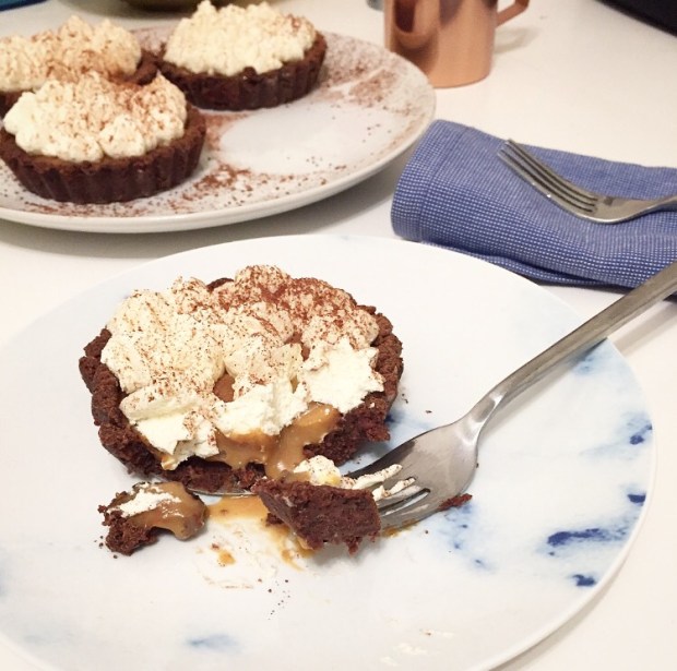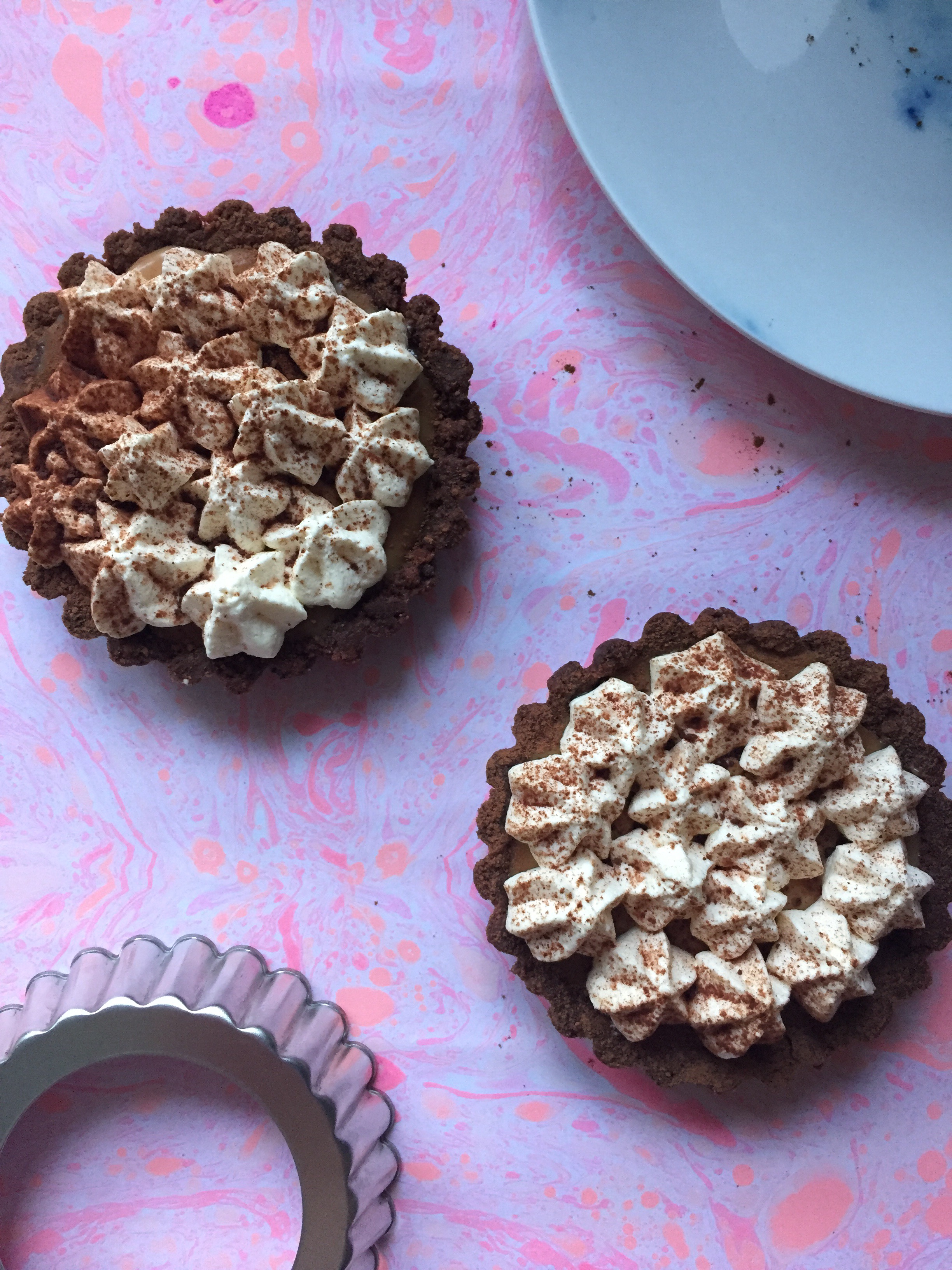 3. Place back in the fridge whilst you whip the cream then pipe swirls of whipped cream on top of the tarts and dust with cocoa powder/chocolate shavings whatever your heart desires
